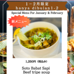 1月2月の期間限定メニューはソトババッ / Soto Babat Sapiです。八王子のみの限定メニューです。(Hanya tersadia di Kuta Bali Cafe hachiouji)